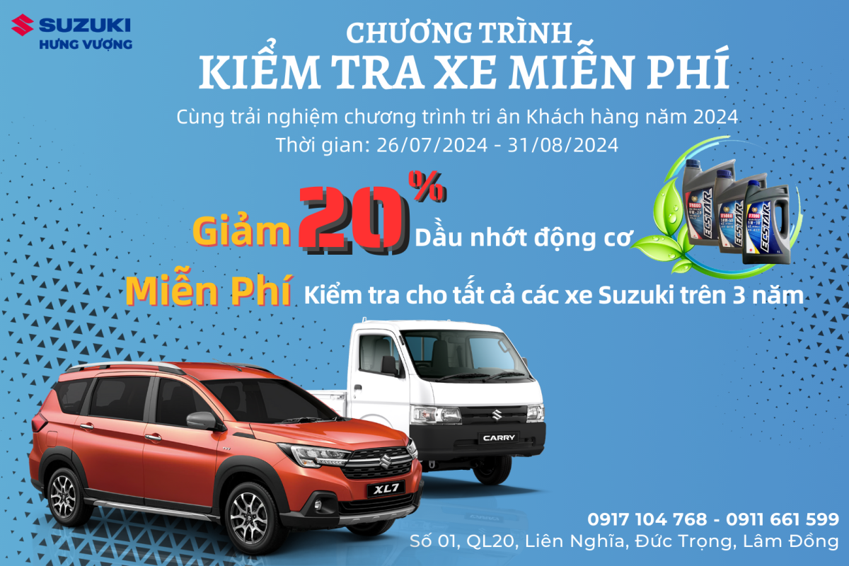 Nhằm tri ân sự tin tưởng và ủng hộ của Quý khách hàng, Suzuki Hưng Vượng triển khai chương trình tri ân đặc biệt “KIỂM TRA XE MIỄN PHÍ 2024” dành cho tất cả khách hàng đang sử dụng xe ô tô Suzuki. Chương trình áp dụng từ 26/07/2024 đến 31/08/2024, với nhiều ưu đãi hấp dẫn: